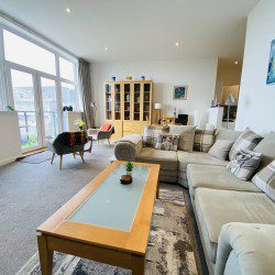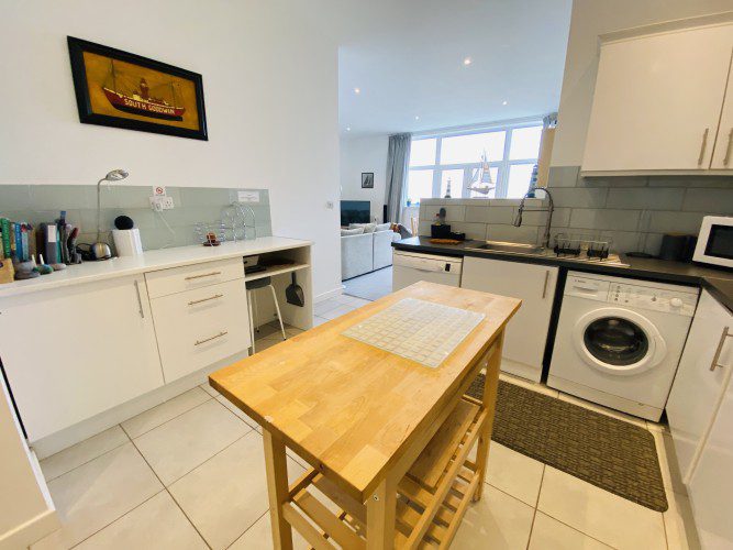 The apartment is located in one of the largest buildings on Portland, which also houses private apartments, a secondary school, a hotel (including restaurant), and a business park. Don’t let that worry you, though – it’s surprisingly quiet and secure.